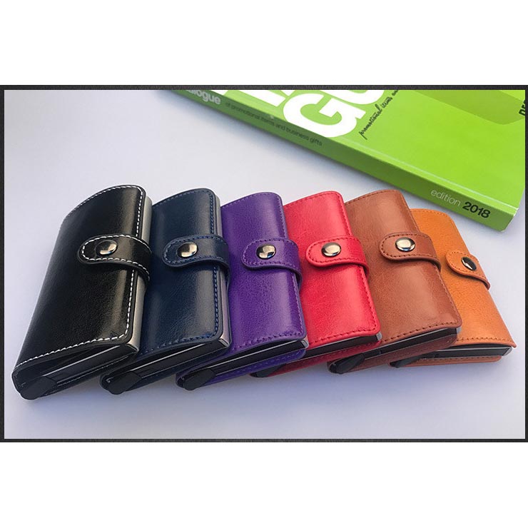 Présentation d'un porte-cartes de visite pop-up unisexe peu encombrant en aluminium avec protection RFID, idéal pour les hommes et les femmes à la recherche d'une solution de portefeuille compacte mais sécurisée.